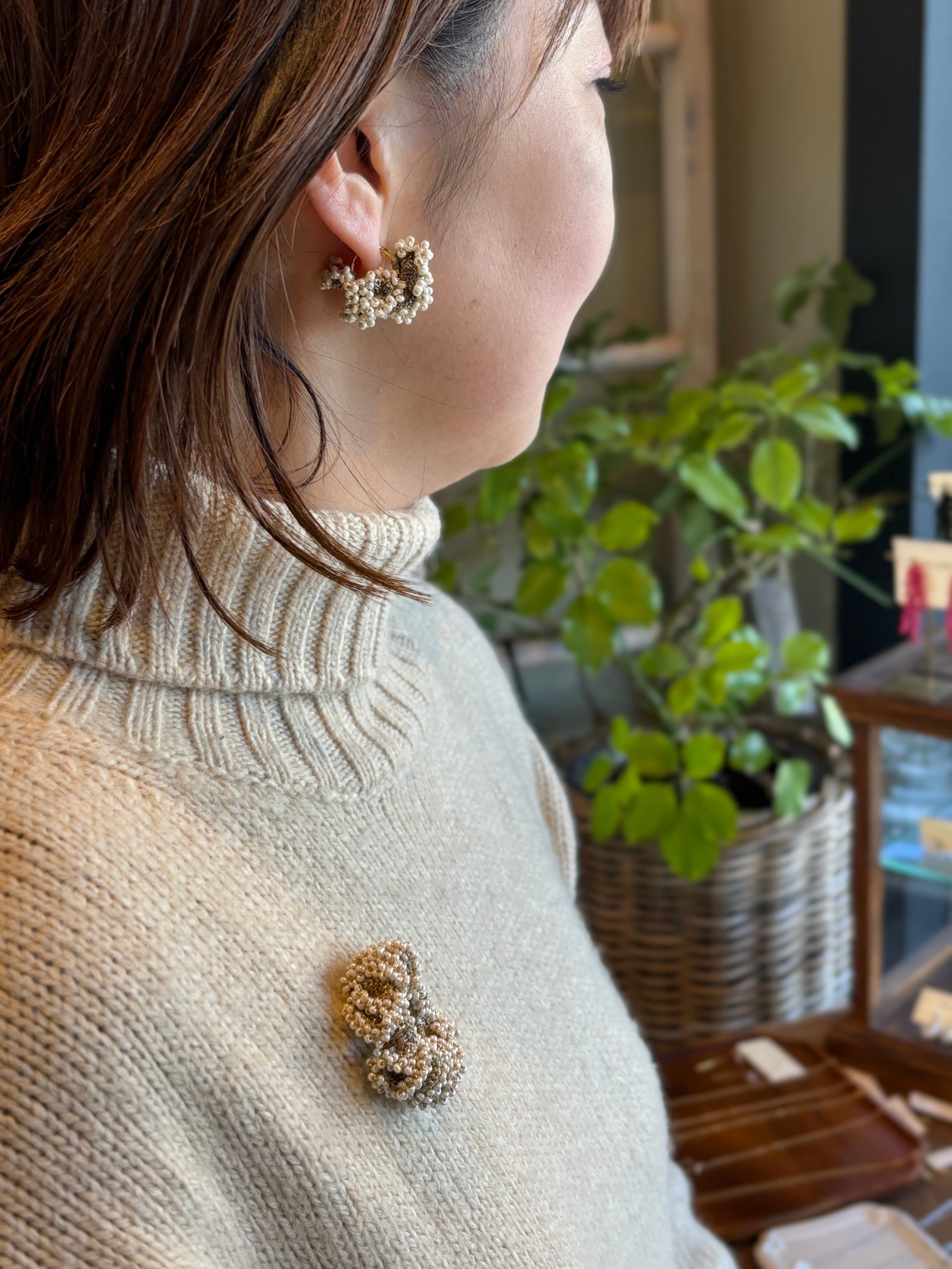 パールビーズを糸に通し、まるでフリルのように軽やかに編まれたこのイヤーアクセサリーは、イソギンチャクのデザインがインスピレーションとなっています。繊細で優雅な形状が、身につけることで存在感を持ちつつも、コーディネートに自然と溶け込む調和を生み出します。